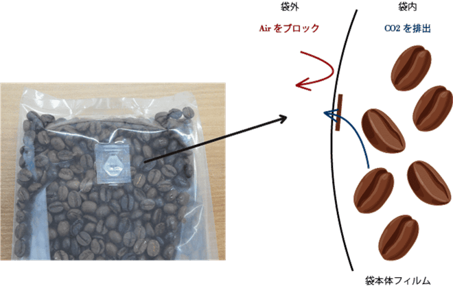 アロフィニティバルブ・・・焙煎後のコーヒー豆からでる炭酸ガスを袋外に放出し袋の破袋を防ぎ、袋外からの空気の侵入を防ぎます。