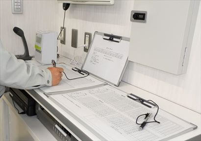 人が加工エリアに入場の際は指定のユニフォームに着替え、靴を履き替え入室記録を記入します。次に粘着ロールにて全身のホコリ等を取り、手洗い→アルコールでの手指消毒→服装チェックとします。