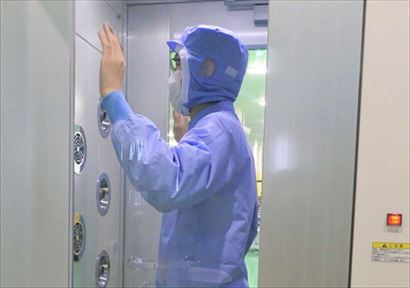 前室からエアーシャワーを通り加工エリアに入場できます。エアーシャワー内ではゆっくり体を回転させ体全体にエアーをあて、足元の粘着シートで靴底の異物をとります。